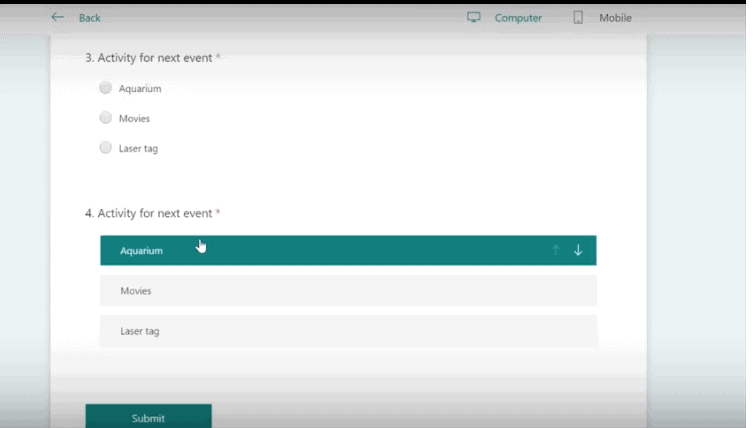 You can see that in questions 3 they can choose an answer and in question 4 they can rank their answers.