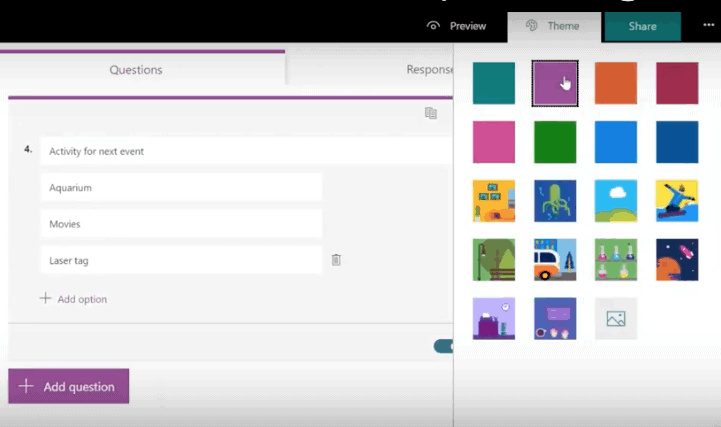Changing the Theme is easy too. Just click on Theme and you have many choices of color and design for your survey.